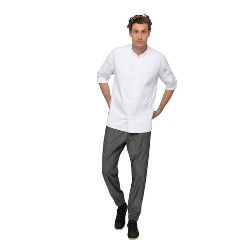 Valencia Prestige Knit Chef Coat, single-breasted, long sleeves with piping detail on seams, turn-back cuffs, concealed snap closure, contrast fabric with stretch knit and Cool Vent™ panels, side seam slits, back collar apron holder with engraved snap, left and right sleeve pockets, modern fit, 65/35 poly/cotton twill, white, S