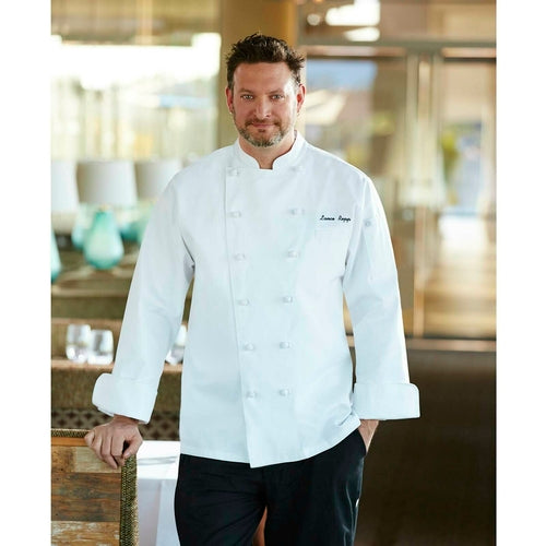 Montreux Executive Chef Coat, double-breasted, long sleeves, French cuffs, cloth-knot buttons, thermometer pocket, classic fit, 100% cotton, white, size 36