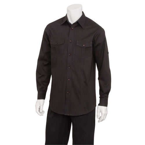 Men's Pilot Shirt, roll-up long sleeves with button tab, 2-button cuffs, double back yoke, buttoned front , (2) front pockets with flaps, classic fit, 64/34/2 poly/cotton/elastane, black, small