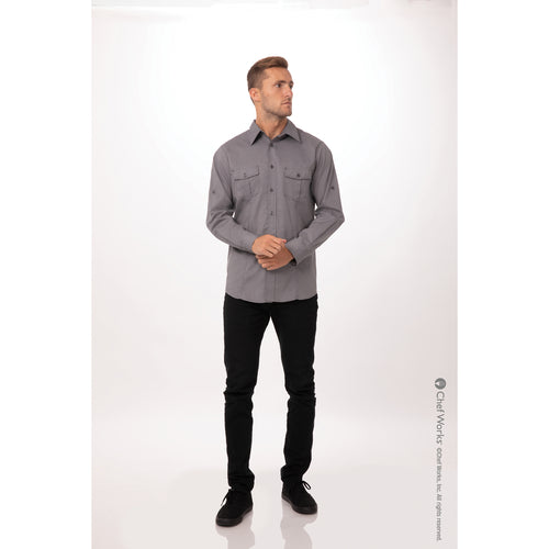 Men's Pilot Shirt, roll-up long sleeves with button tab, 2-button cuffs, double back yoke, buttoned front, (2) front pockets with flaps, classic fit, 64/34/2 poly/cotton/elastane, gray, 3XL