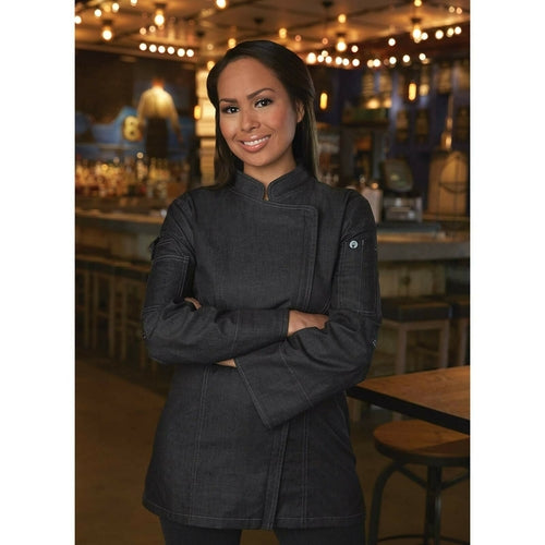 Women's Gramercy Chef Coat, single-breasted, roll-up long sleeves with tab, 2-way separating zipper, back collar apron holder with engraved snap, contrast double-stitching throughout, left sleeve rounded thermometer pocket, right sleeve rounded cell phone/notebook pocket with hidden earphone hole, slim fit, 100% cotton denim, black, XS