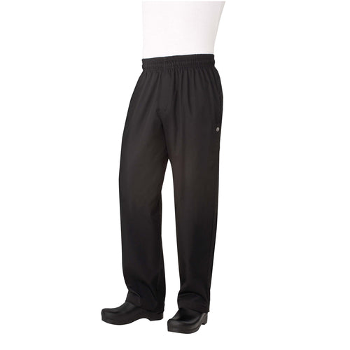 Essential Baggy Pants, elastic waistband with drawstring, zipper fly, tapered legs, (2) side seam pockets, (1) back pocket, classic fit, 65/35 poly/cotton, black, medium