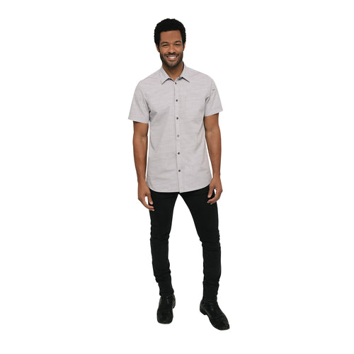 Havana Shirt, short sleeves, side hem detail, snap front closure, left sleeve pocket, left chest patch pocket, back collar apron holder with snap button, back yoke with pleats, modern fit, 65/35 poly/cotton, gray, 2XL