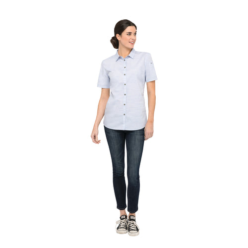 Women's Havana Shirt, short sleeves, side hem detail, snap front closure, front darts, left sleeve pocket, back collar apron holder with snap button, back yoke with pleats, modern fit, 65/35 poly/cotton, blue, L