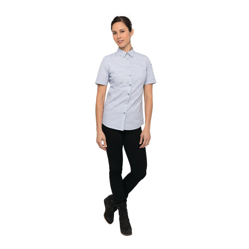 Women's Havana Shirt, short sleeves, side hem detail, snap front closure, front darts, left sleeve pocket, back collar apron holder with snap button, back yoke with pleats, modern fit, 65/35 poly/cotton, navy, M