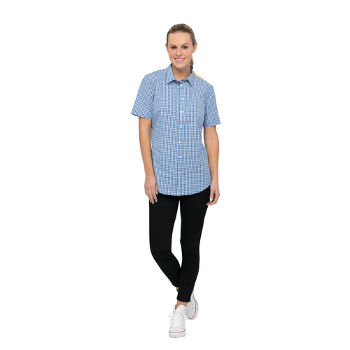 Women's Gingham Shirt, short sleeves, contrast fabric on inner sleeve band, button front, top right placket and inner collar band, back yoke with inverted pleat, modern fit, 65/35 yarn-dyed poly/cotton, blue, XS