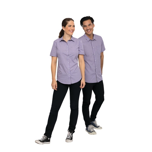 Women's Gingham Shirt, short sleeves, contrast fabric on inner sleeve band, button front, top right placket and inner collar band, back yoke with inverted pleat, modern fit, 65/35 yarn-dyed poly/cotton, purple, L