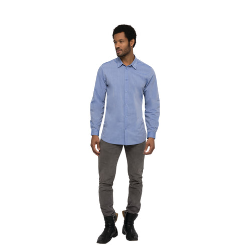 Men's Chambray Dress Shirt, roll-up long sleeves with button tab, 2-button cuff, side hem detail, back yoke with pleats, tonal button front closure, modern fit, finish, 65/35 poly/cotton, blue, L
