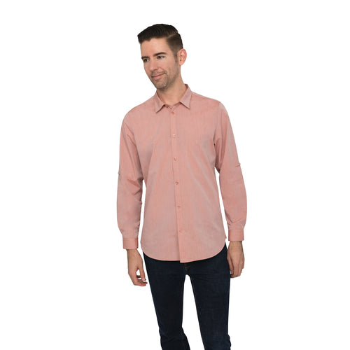 Men's Chambray Dress Shirt, roll-up long sleeves with button tab, 2-button cuff, side hem detail, back yoke with pleats, tonal button front closure, modern fit, finish, 65/35 poly/cotton, cinnamon, M