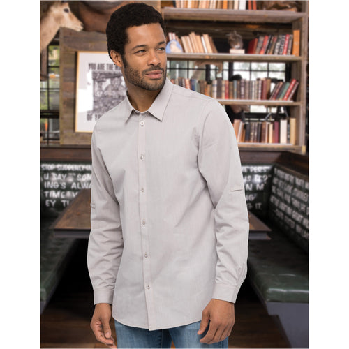 Men's Chambray Dress Shirt, roll-up long sleeves with button tab, 2-button cuff, side hem detail, back yoke with pleats, tonal button front closure, modern fit, finish, 65/35 poly/cotton, light gray, XL
