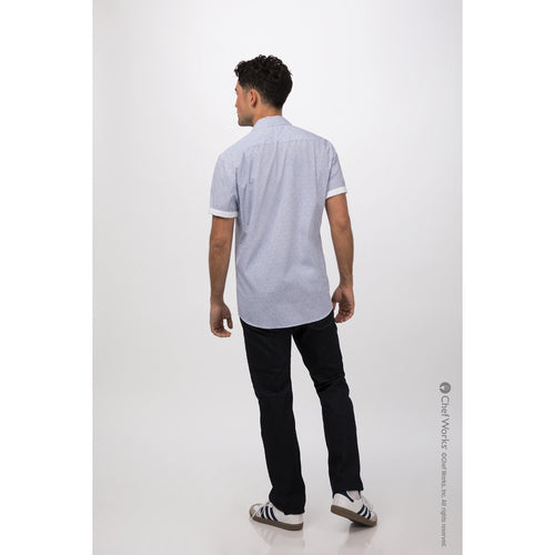 Men's Charleston Shirt, short sleeves, contrast fabric on inner sleeve band & inner collar band, matching button front, left sleeve pocket, back yoke with pleats for fit, 65/35 poly/cotton, "ditsy print", blue, large