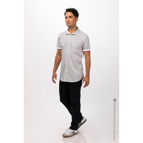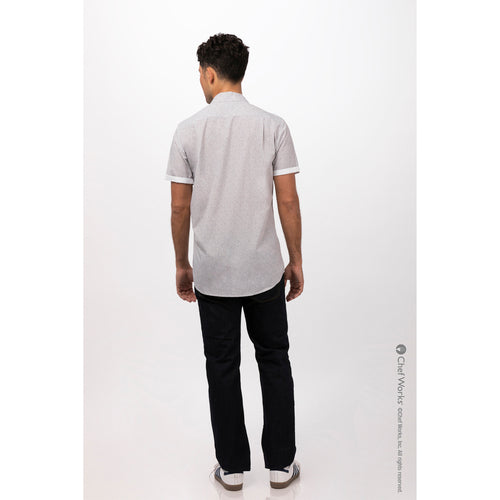 Men's Charleston Shirt, short sleeves, contrast fabric on inner sleeve band & inner collar band, matching button front, left sleeve pocket, back yoke with pleats for fit, 65/35 poly/cotton, "ditsy print", natural, small