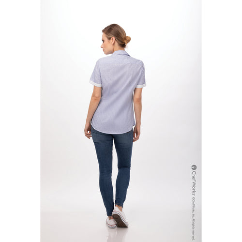 Women's Charleston Shirt, short sleeves, contrast fabric on inner sleeve band & inner collar band, collared v-neck, matching button front, left sleeve pocket, back yoke, front & back darts, side seam slits, 65/35 poly/cotton, "ditsy print", blue, small