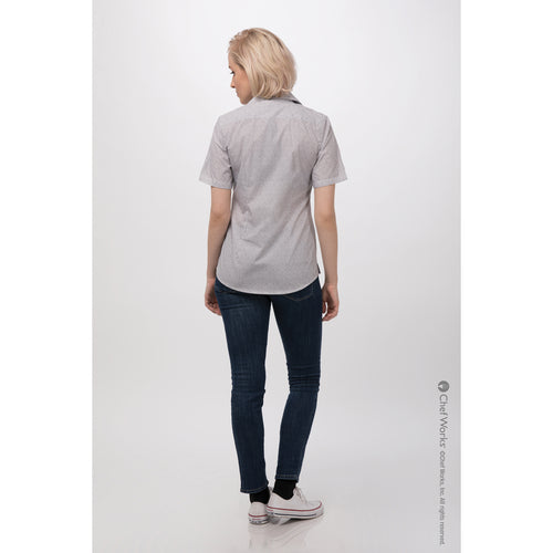 Women's Charleston Shirt, short sleeves, contrast fabric on inner sleeve band & inner collar band, collared v-neck, matching button front, left sleeve pocket, back yoke, front & back darts, side seam slits, 65/35 poly/cotton, "ditsy print", natural, XS