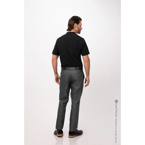 Men's Seersucker Shirt, short sleeves, snap front closure, banded collar with back collar apron holder snap tab, left sleeve inset pocket, back yoke with darts, side seam slits, 65/35 poly/cotton, black, 2XL