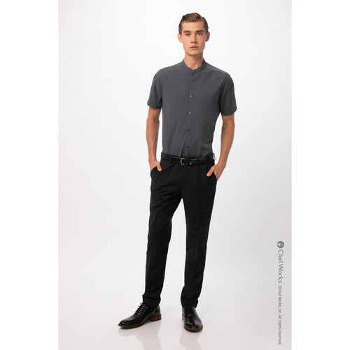 Men's Seersucker Shirt, short sleeves, snap front closure, banded collar with back collar apron holder snap tab, left sleeve inset pocket, back yoke with darts, side seam slits, 65/35 poly/cotton, charcoal, 3XL