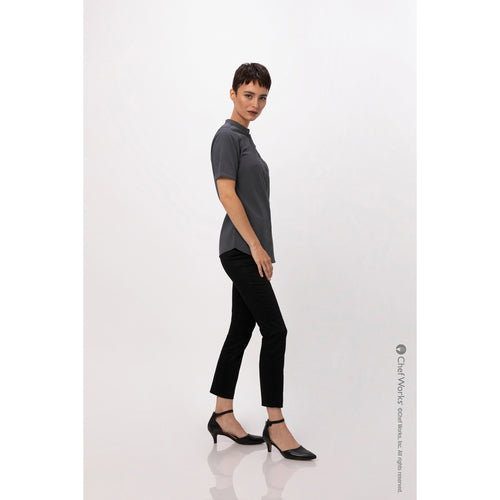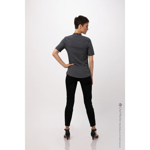 Women's Seersucker Shirt, short sleeves, snap front closure & front darts, banded collar with back collar apron holder snap tab, left sleeve inset pocket, back yoke with darts, side seam slits, 65/35 poly/cotton, charcoal, 2XL