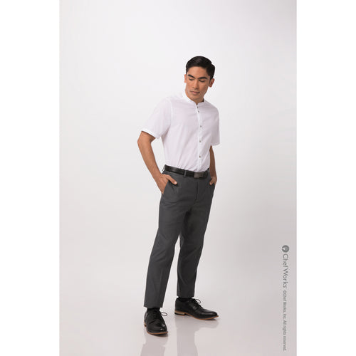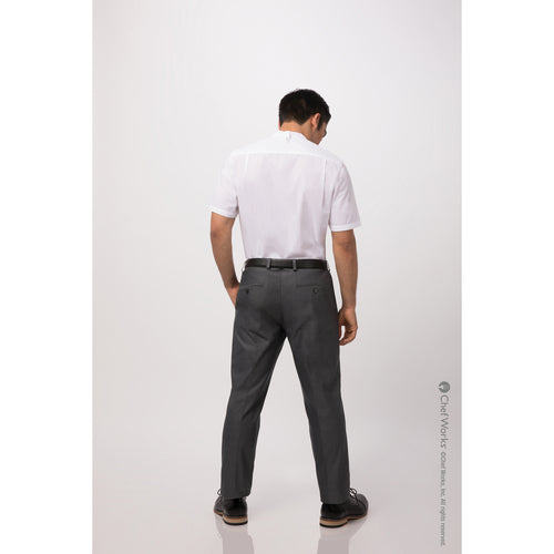 Men's Seersucker Shirt, short sleeves, snap front closure, banded collar with back collar apron holder snap tab, left sleeve inset pocket, back yoke with darts, side seam slits, 65/35 poly/cotton, white, medium