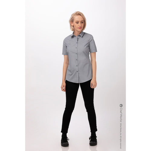 Women's Malibu Shirt, short sleeves, matching button front, left sleeve pocket, front * back darts, 65/35 poly/cotton, gray, medium