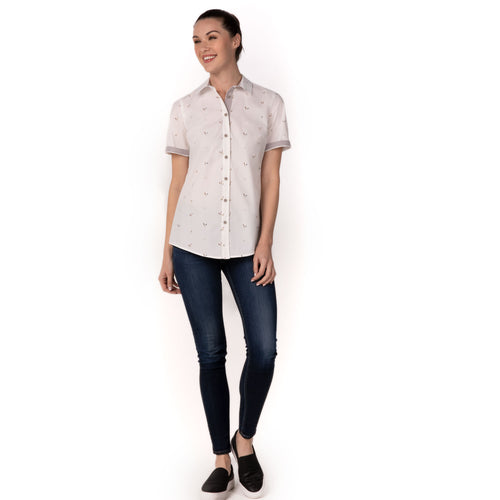 Women's Omaha Shirt, short sleeves, matching button front, left chest pocket, contrast collar band & inner sleeve hem, 65/35 poly/cotton, "animal print", white, XS