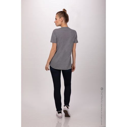 Women's Striped T-shirt, short sleeves, crew neck, reverse cover stitch detail, curved hem, 60/40 poly/cotton, gray, small