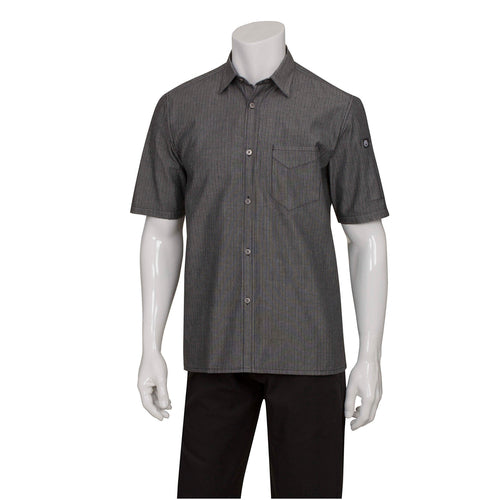 Men's Detroit Shirt, hybrid style, short sleeves, antique metal buttons, left chest and left sleeve thermometer pockets, classic fit, enzyme wash, 100% lightweight cotton denim, striped black, 3XL