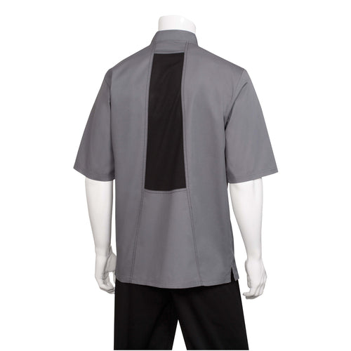 Valais Chef Coat, single-breasted, short sleeves, Cool Vent™ back and underarm panels, branded top snap, contrast topstitching, side seam slits, cloth-covered buttons, left chest patch and thermometer pockets, classic fit, 65/35 poly/cotton twill, gray with black contrast, small