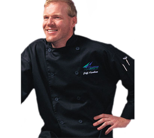 Chef Revival® Traditional Chef's Jacket, X-large, pen/thermometer pocket, long sleeve, Chef logo 12 black buttons, traditional collar, drop shoulder & yoke, Chef-tex™ poly cotton, black