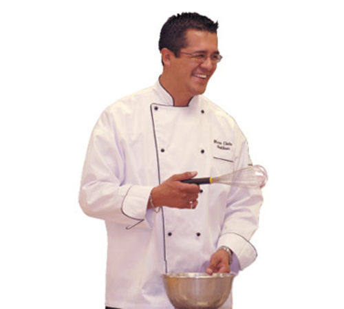 Chef Revival® Brigade Chef's Jacket, small, pen/thermometer pocket, black push through 12 buttons, traditional collar, drop shoulder & yoke, Chef-tex™ poly/cotton, white with black piping