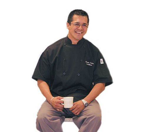 Chef Revival® Traditional Chef's Jacket, X-small, short sleeve, pen/thermometer pocket, Chef logo black 12 button, traditional collar, drop shoulder & yoke, Chef-tex™ poly/cotton, black
