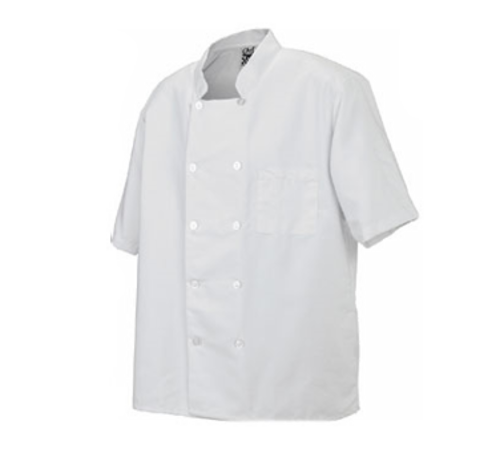 Chef Revival® Basic Chef's Jacket, large, universal fit, double breasted, short sleeve, front chest and pen/thermometer pocket, clear pearl 10 buttons, traditional collar, poly/cotton, white