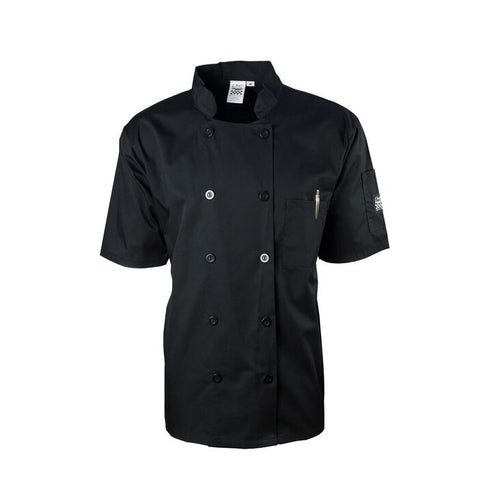 Chef Revival® Basic Chef's Jacket, small, universal fit, double breasted, short sleeve, front chest and pen/thermometer pocket, clear pearl 10 buttons, traditional collar, poly/cotton, black