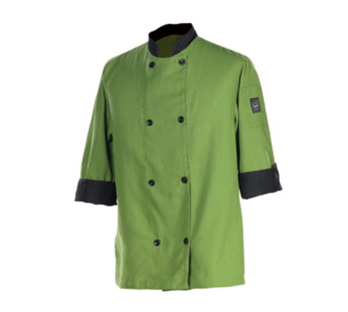 Chef Revival® Fresh Chef's Jacket, large, 3/4 sleeve, black chef logo buttons, double breasted with traditional collar, pen/thermometer sleeve pocket, poly/cotton, mint green with black collar and cuffs, Chef 24/7®
