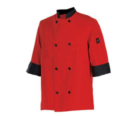 Chef Revival® Fresh Chef's Jacket, medium, 3/4 sleeve, black chef logo buttons, double breasted with traditional collar, pen/thermometer sleeve pocket, poly/cotton, tomato red with black collar and cuffs, Chef 24/7®