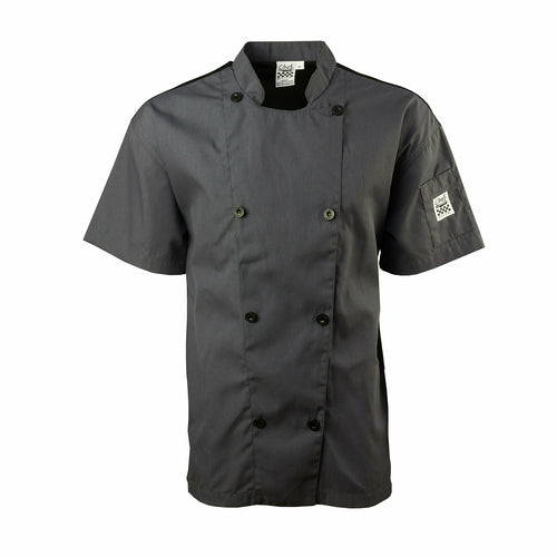 Chef Revival® Performance Series Jacket, X-small, double breasted, traditional collar, 8 chef logo buttons, short sleeve, sleeve pocket, mesh back, poly/cotton blend, pewter grey