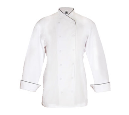 Chef Revival® Ladies Corporate Chef's Jacket, large, pen/thermometer pocket, cloth covered 12 buttons, side slit, cross collar neckline, Chef-tex™ poly/cotton, white with black piping