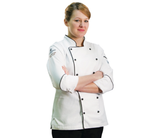 Chef Revival® Ladies Brigade Chef's Jacket, X-large, pen/thermometer pocket, black push through 12 buttons, traditional collar, black piping, Chef-tex™ poly/cotton, white with black piping