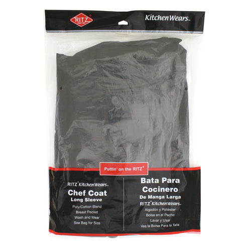 Ritz® Kitchen Wears™ Chef's Coat, 10-button, long sleeve, reversible closure touts, left front pocket, thermometer pocket on sleeve, fold back cuffs, cotton/poly twill, XL (48-50), black (retail packaging)