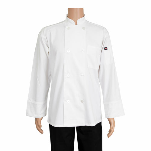 Ritz® Kitchen Wears™ Economy Chef's Coat, 8-button, long sleeve, reversible closure touts, left front pocket, thermometer pocket on sleeve, fold back cuffs, cotton/poly twill, 1XL (48-50), white (retail packaging)