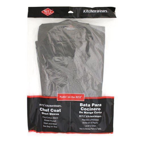 Ritz® Kitchen Wears™ Chef's Coat, 10-button, short sleeve, reversible closure, left front pocket, thermometer pocket on sleeve, cotton poly twill, small (36-38), black (retail packaging)