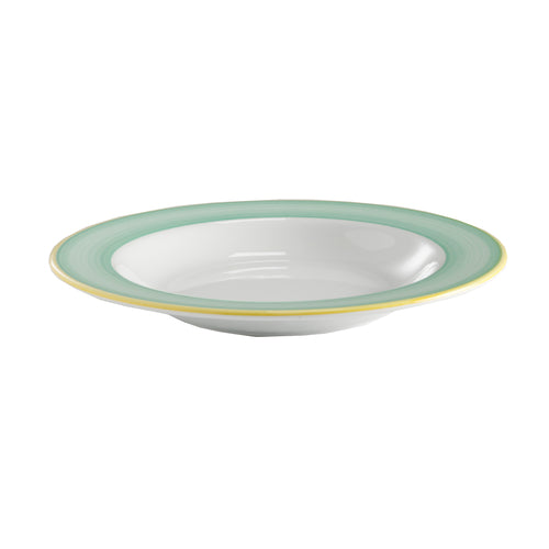 Pasta Bowl, 18-4/5 oz., 12" dia., round, rimmed, scratch/chip resistant, microwave, dishwasher & oven safe up to 380°F, porcelain, yellow edge, Corona, Calypso, Green (Stocked Item)