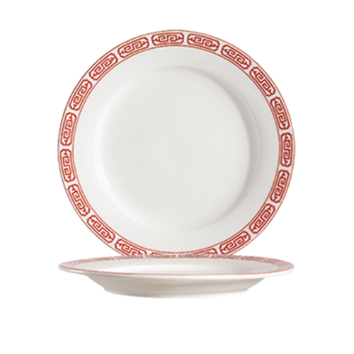 Red Gate Plate, 10-1/4" dia. x 1-1/8"H, round, rolled edge, dishwasher, oven and microwave safe, porcelain, Red/Bone White (Sold by case)