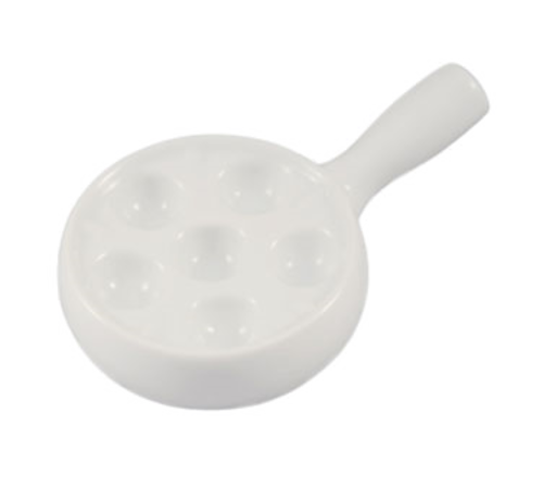 Escargot Dish, 10-3/4"L x 7-1/2"W x 1-1/2"H, round, with handle, dishwasher, oven and microwave safe, porcelain, Super White (Sold by case)