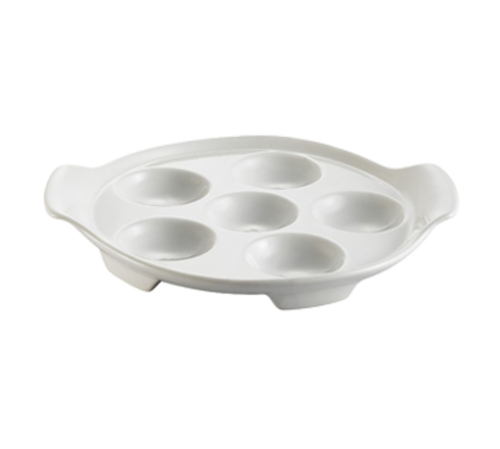 Escargot Dish, 8-1/2"L x 7-1/4"W x 1-1/4"H, round, with 2 handles, dishwasher, oven and microwave safe, porcelain, Super White (Sold by case)