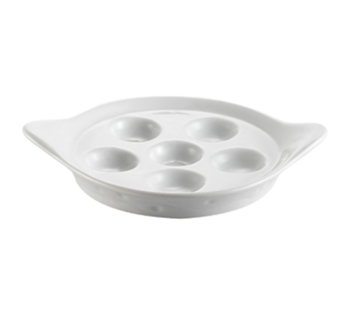 Escargot Dish, 8-1/4"L x 6-1/2"W x 1-1/4"H, round, with 2 handles, dishwasher, oven and microwave safe, porcelain, Super White (Sold by case)