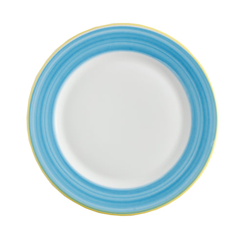 Plate, 10-5/8" dia., round, rolled edge, scratch/chip resistant, microwave, dishwasher & oven safe up to 380°F, porcelain, yellow edge, Corona, Calypso, Blue (Stocked Item)