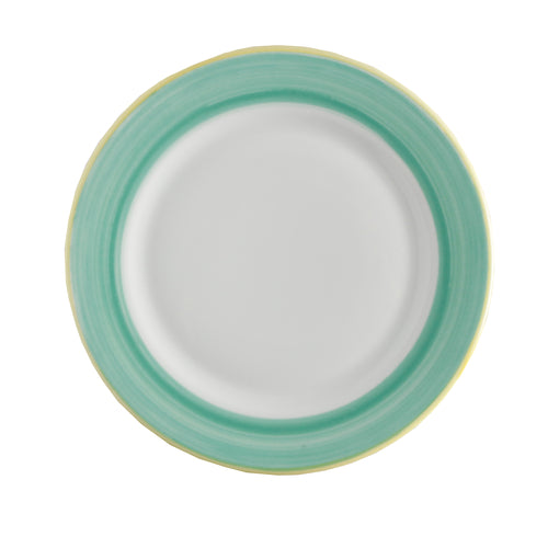 Plate, 9" dia., round, rolled edge, scratch/chip resistant, microwave, dishwasher & oven safe up to 380°F, porcelain, yellow edge, Corona, Calypso, Green (Stocked Item)