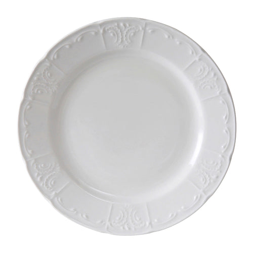 Plate, 9-3/4" dia., round, wide rim, embossed, microwave & dishwasher safe, oven proof, fully vitrified, lead-free, TuxCare®©, Healthcare, Chicago, Porcelain White