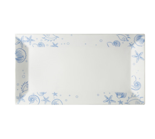 Atlantic Seashell Platter, 18"L x 10"W x 1-3/4"H, rectangular, dishwasher, oven, and microwave safe, porcelain, Blue decorated Rim/Super White (Sold by case)