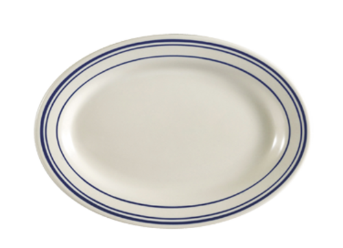 Blue Line Platter, 15-1/2"L x 10"W x 1-1/2"H, oval, rolled edge, dishwasher, oven and microwave safe, stoneware (ceramic), Blue Band/American White (Sold by case)